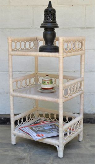 Our 3 Tier Circle Design Wicker Floor Selves are such a great item for so many areas. They are framed out sturdy " broome handle " size pole rattan and wrapped with a flat textured wicker. Notice the pretty circle designs on the sides & around the top.